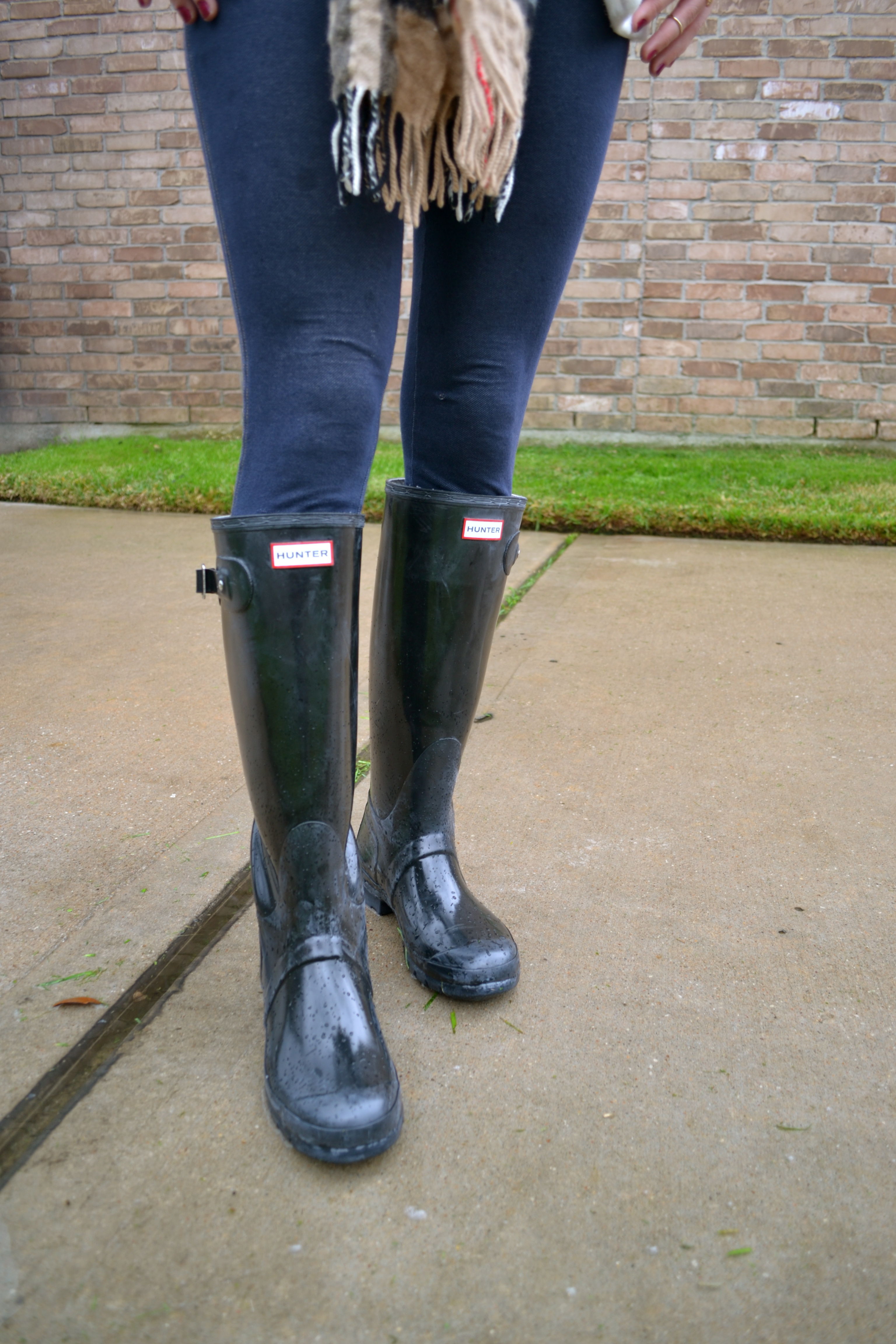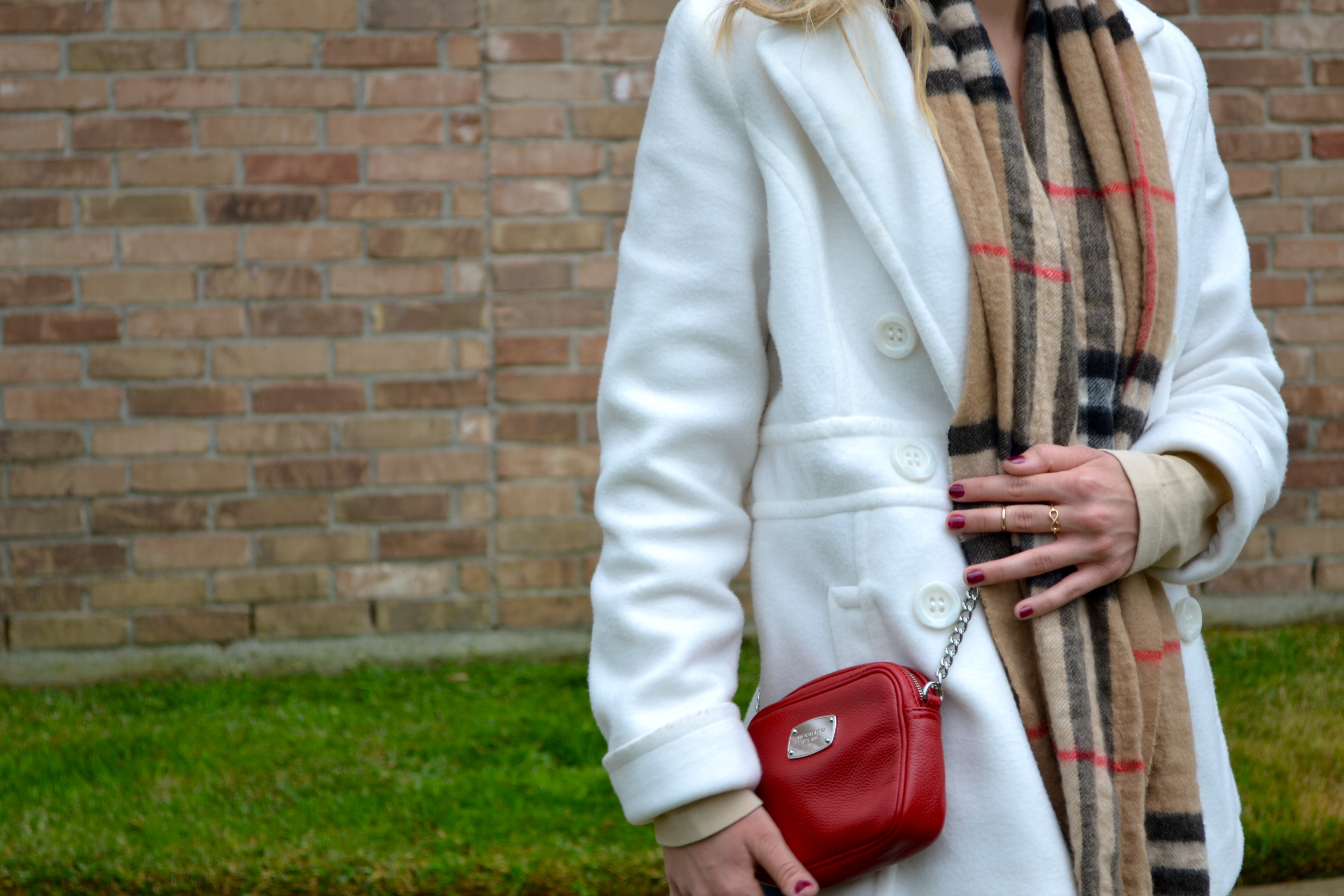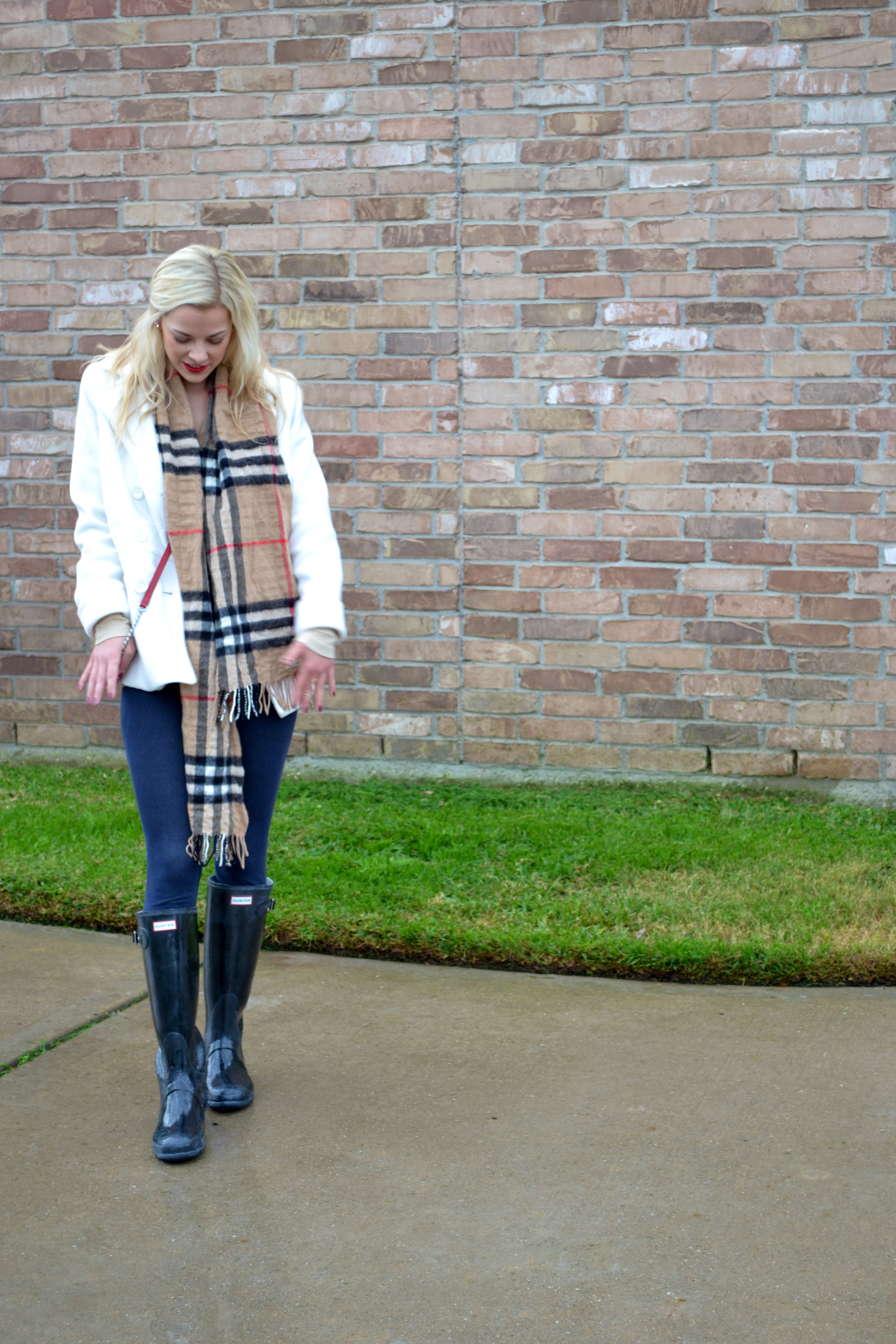 We got quite a bit of rain last night here in Houston, leaving puddles everywhere this morning. While picking out my outfit to run a day of errands in, I went with a pair of Hunter rain boots and a cross-body. I threw on this red Michael Kors because it was easy to hide under my coat if it was to start raining again. This bag just happens to be my favorite of all time, I love it so much that I have it in three colors (oops!). I added a peacoat, scarf, and a few pieces of jewelry and was ready to go! In the process of shooting this post I actually got completely soaked, my piece of advice- jump with caution.