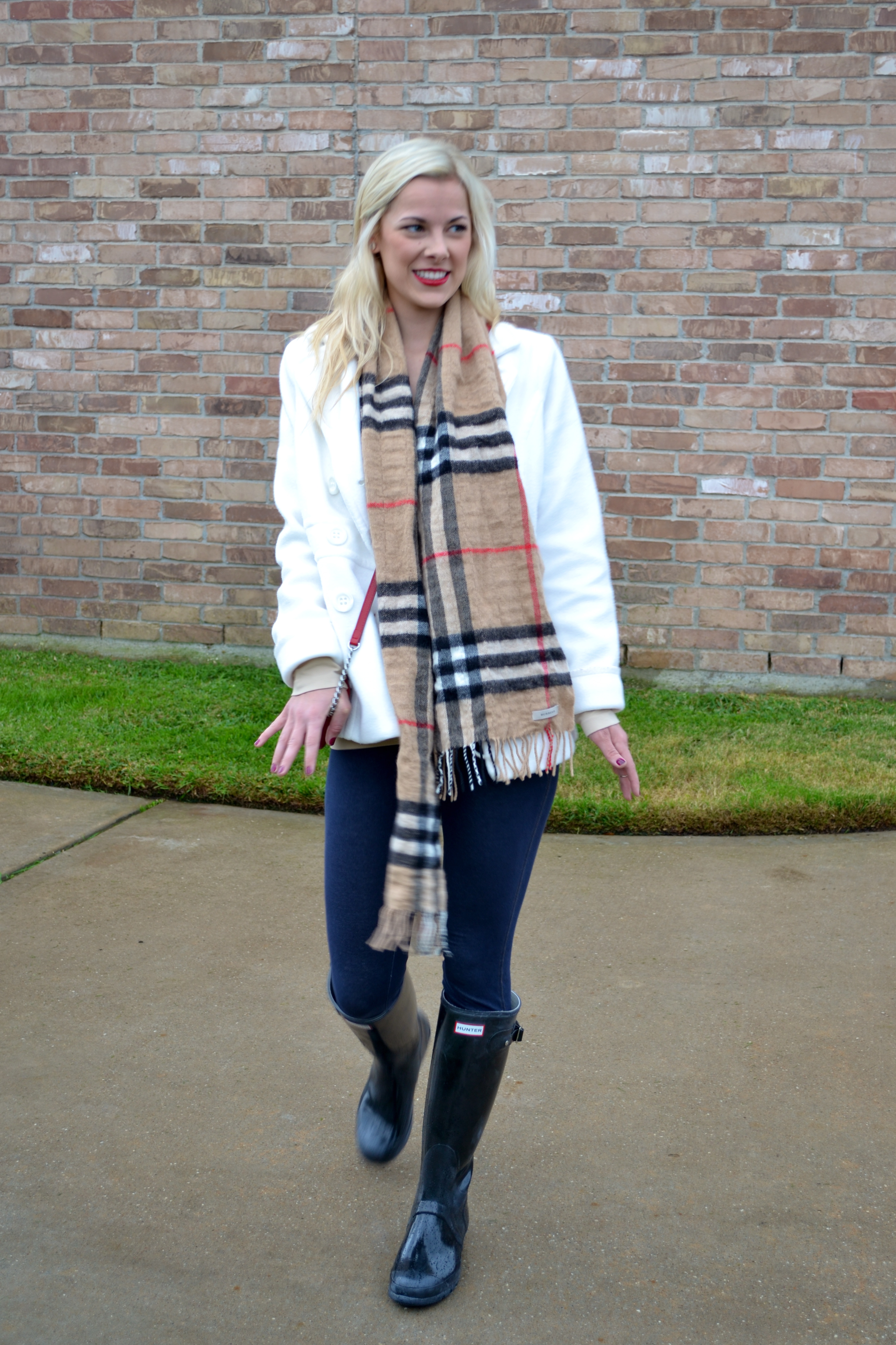 Peacoat: Forever21 | Jeggings: Nordstrom | Long Sleeve: Niki Biki | Scarf: Burberry | Rain boots: Hunter | Bag: Michael Kors | Earrings: Kate Spade | Infinity Ring: Forever21 | Knuckle Ring: Forever21 | Nail Polish: Essie Bahama Mamma | Lipstain: Chanel Ruby Lite