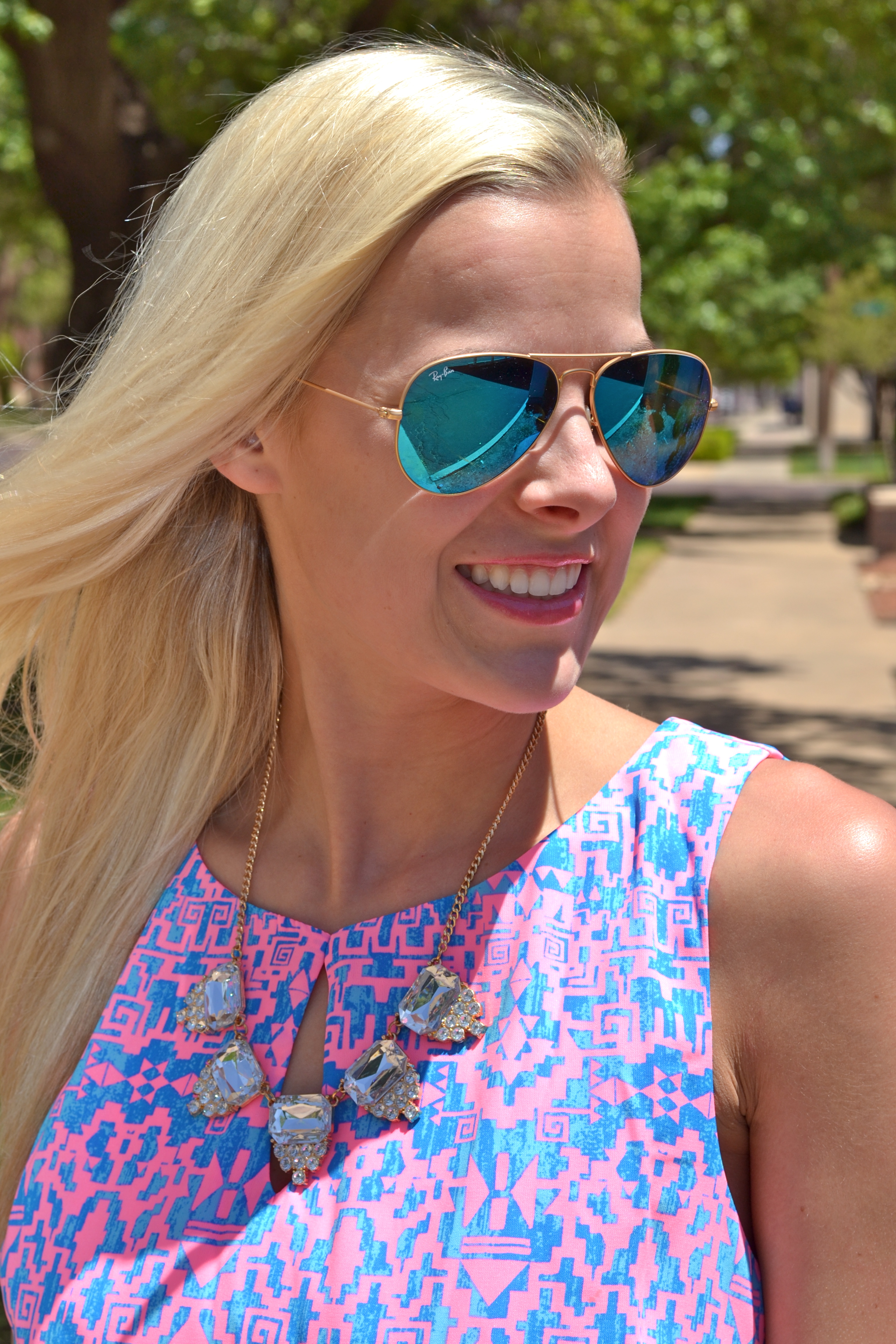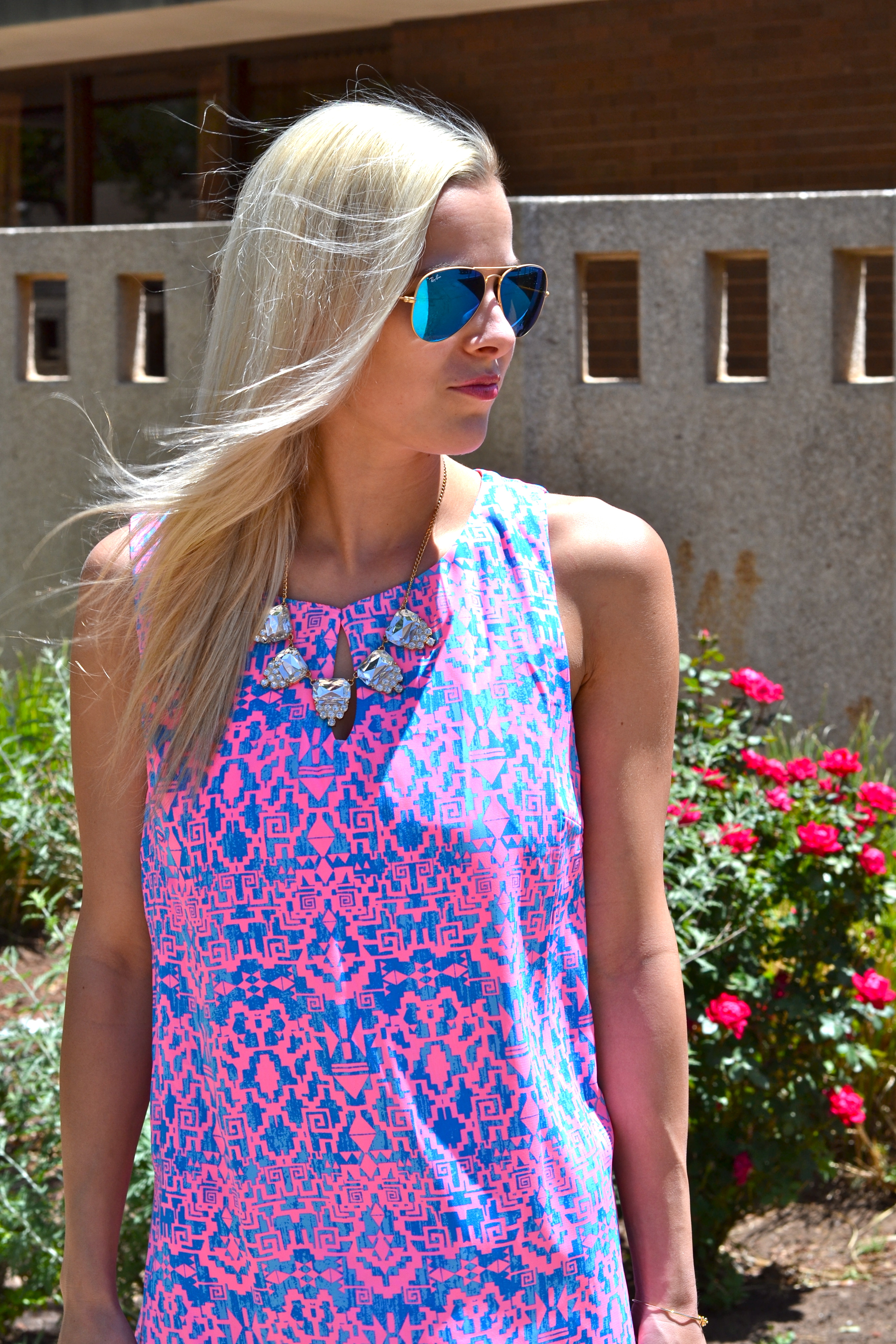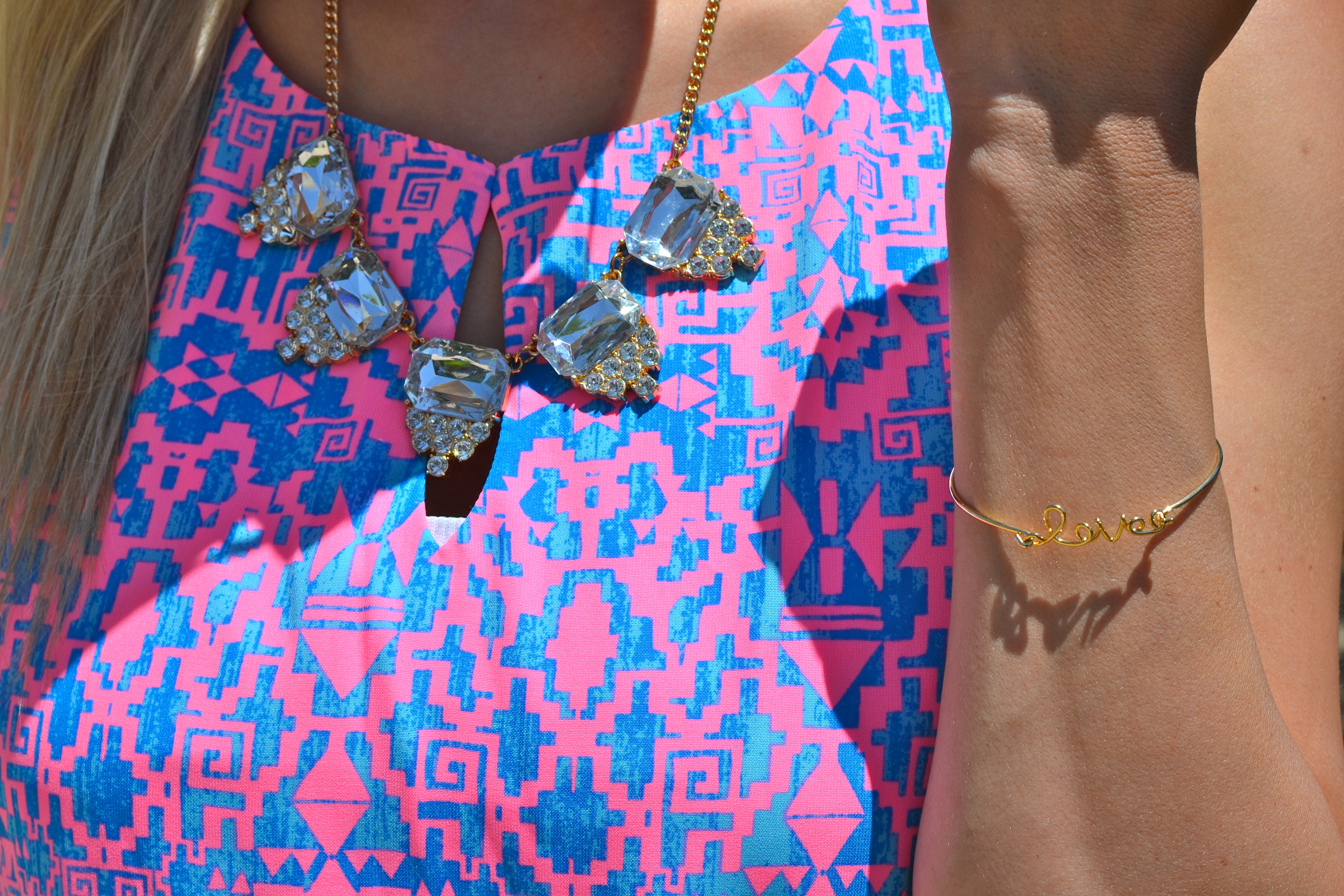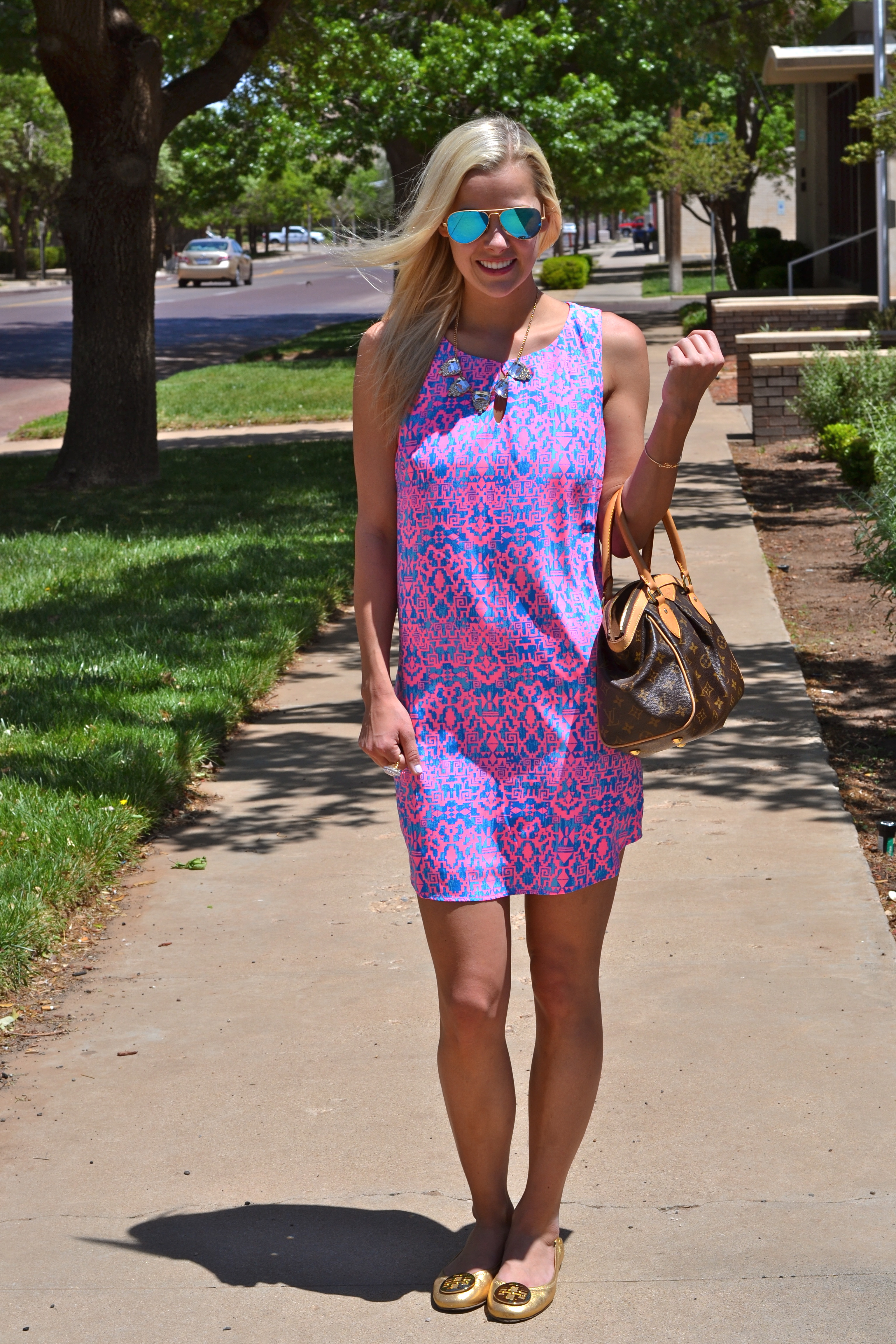 Dress: Lyla’s | Shoes: Tory Burch | Bag: Louis Vuitton | Necklace: Francesca’s (similar) | Bracelet: Shop The Addict (15% with code “lovecourtney”!) | Statement Ring: Ellie’s Sparkles | Sunglasses: Ray-Ban | Nail Polish: Essie Go Ginza | Lip Gloss: Sephora Pink Up Pink