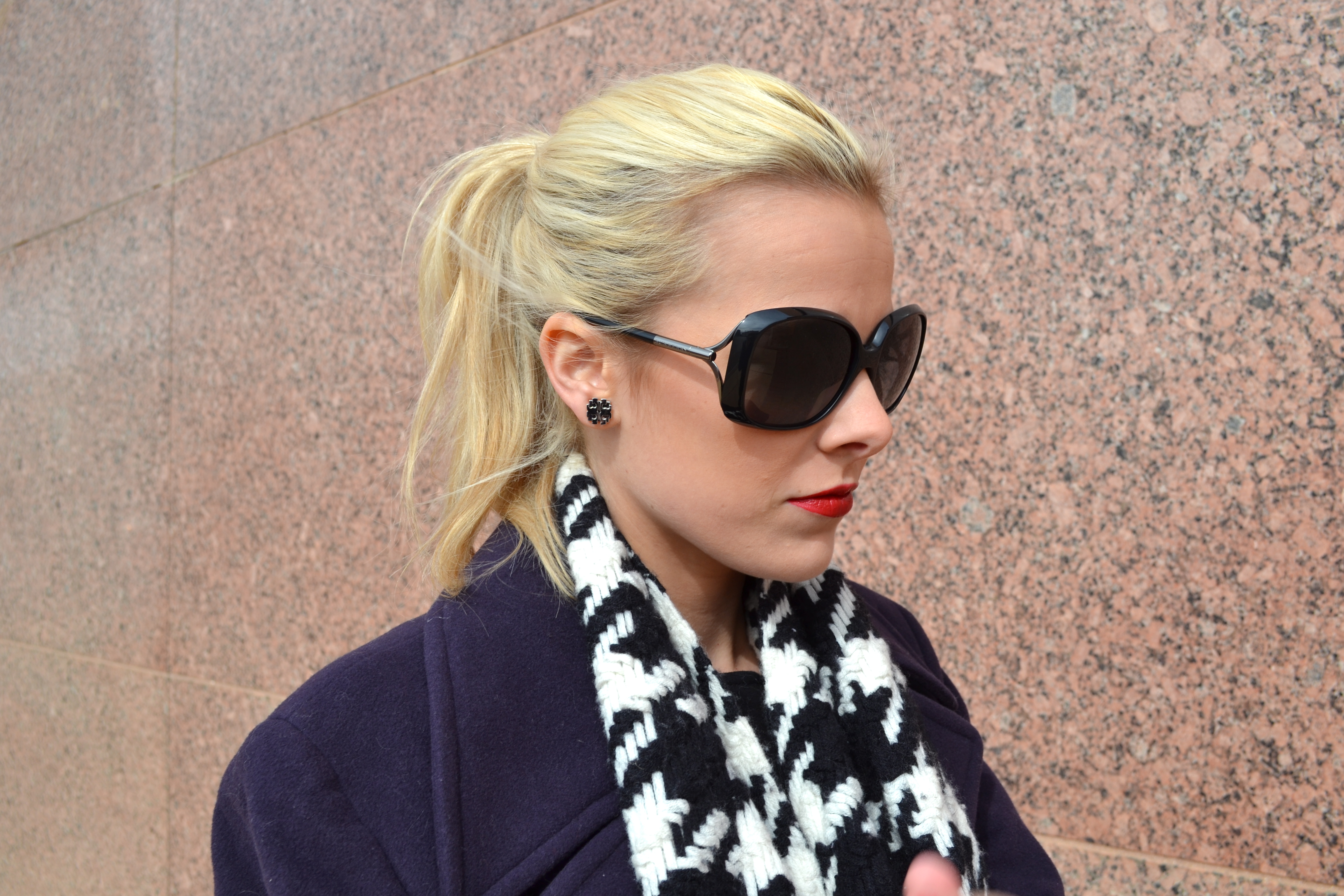 Peacoat: Calvin Klein | Dress: Forever21 | Scarf: Kate Spade | Tights: Nordstrom | Booties: Michael Antonio | Clutch: Tory Burch | Sunglasses: Burberry | Ring: David Yurman | Earings: Tory Burch | Nail Polish: Butter London Pillar Box Red | Lipstick: Sephora Red