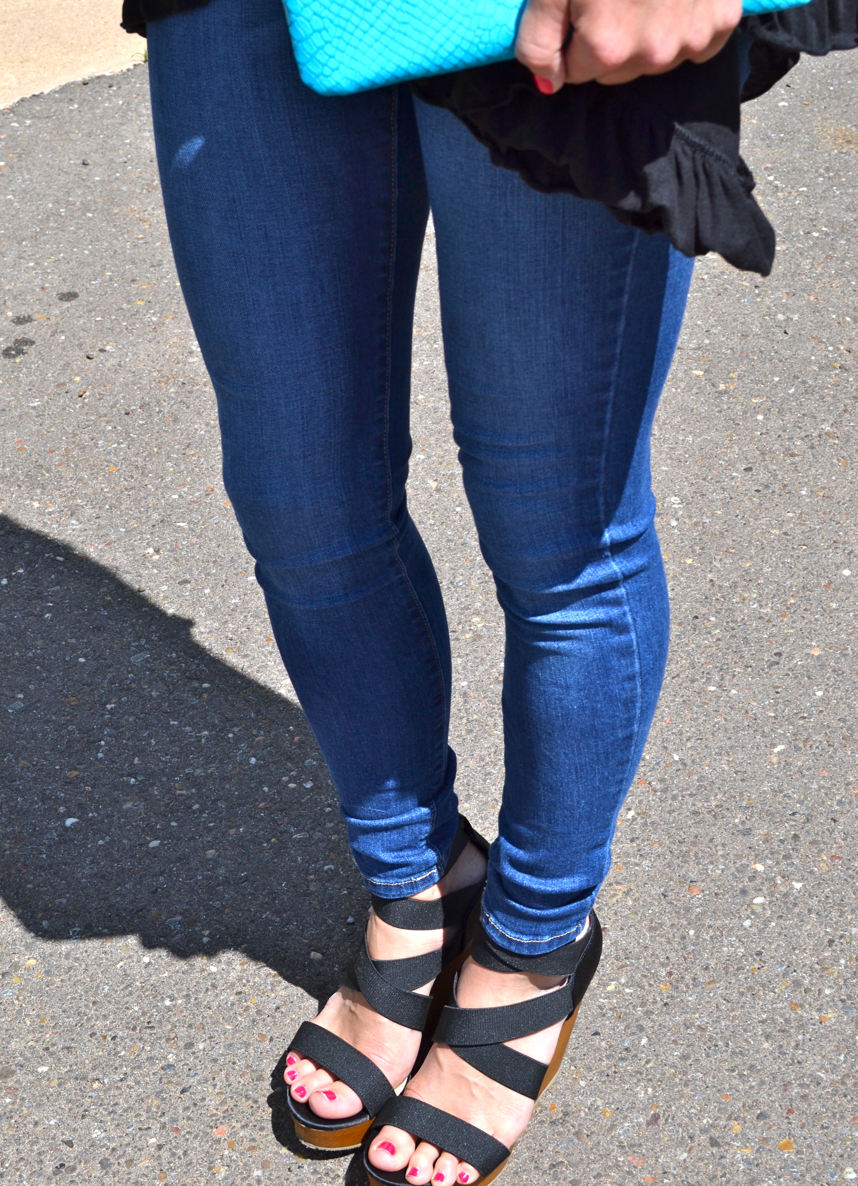 Top: Deja Vu | Jeans: Nordstrom Rack (similar) | Wedges: Steve Madden (similar) | Clutch: GiGi New York | Sunglasses: Ray-Ban | Bracelet: Box of Charms | Nail & Toe Polish: Essie Peach Daiquiri